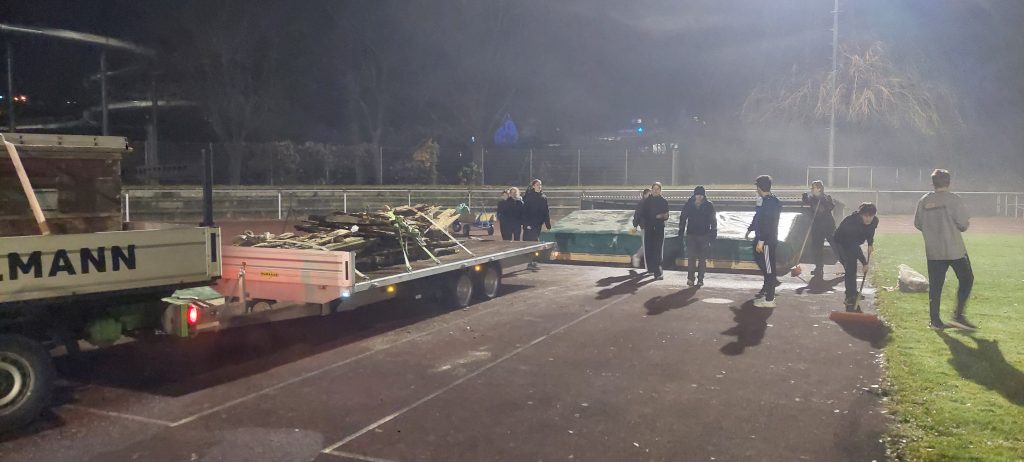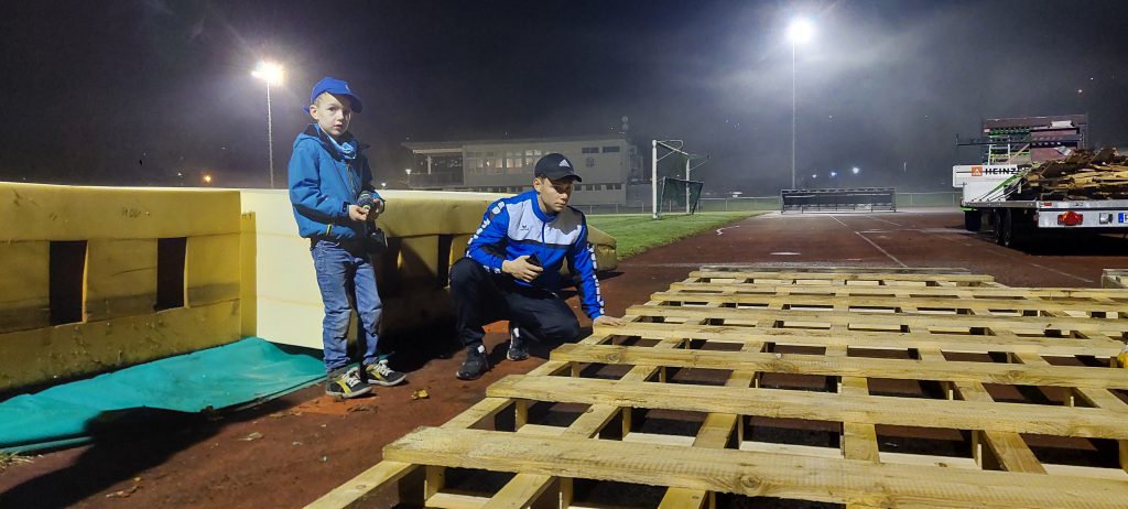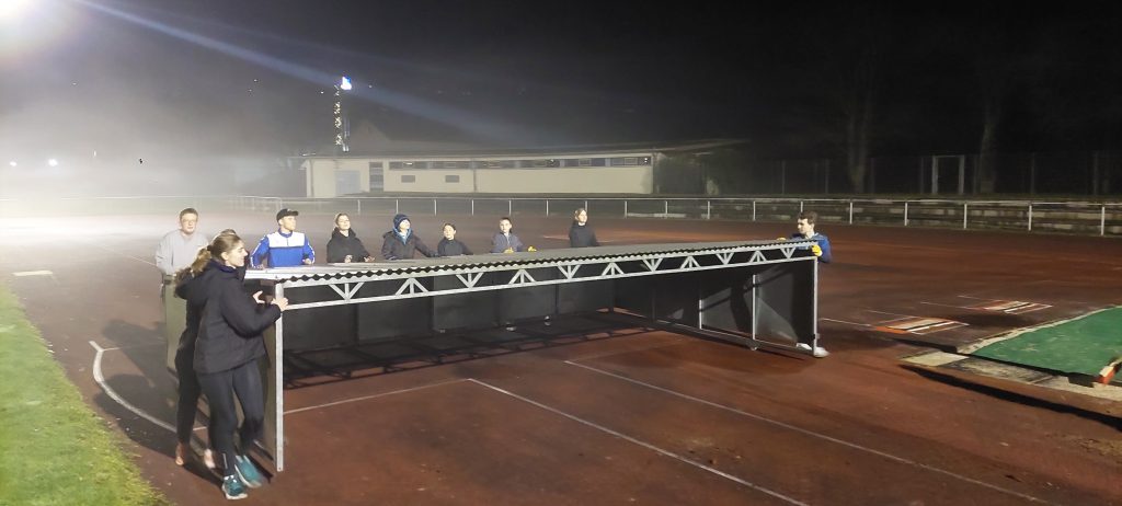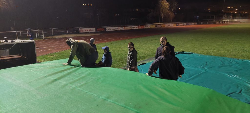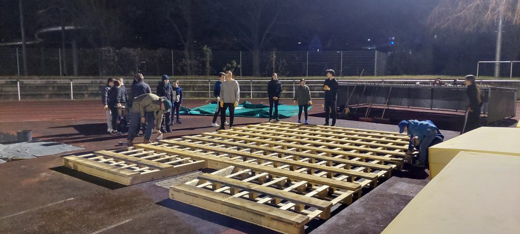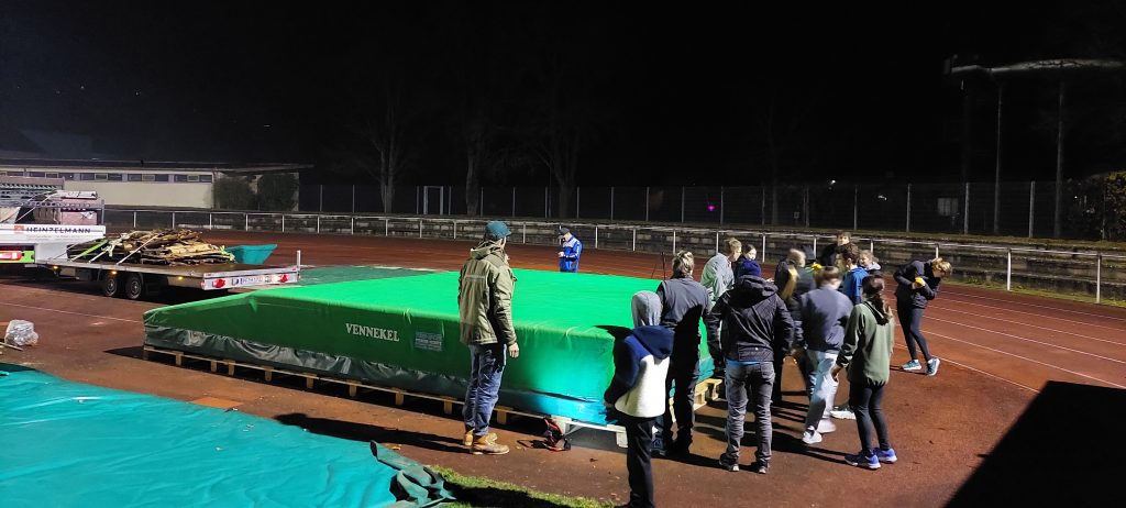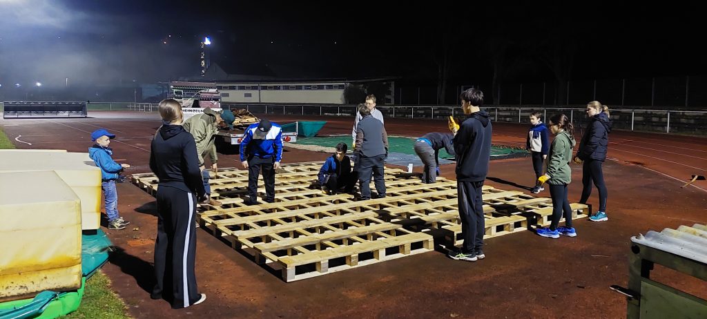 Um auf die nächste Wettkampfsaison vorbereitet zu sein, haben sich unsere Athleten ins Zeug gelegt und bei widrigen Wetterbedingungen den Unterbau der Stabhochsprunganlage neu gemacht. Das alte Holzgestell war dem Zahn der Zeit zum Opfer gefallen und morsch. Es wurde entfernt. Anschließend konnte der von der Firma Heinzelmann gesponserte neue Belag zusammengesetzt werden. Das war nur mit den vielen helfenden Händen machbar war. Vielen Dank an alle!