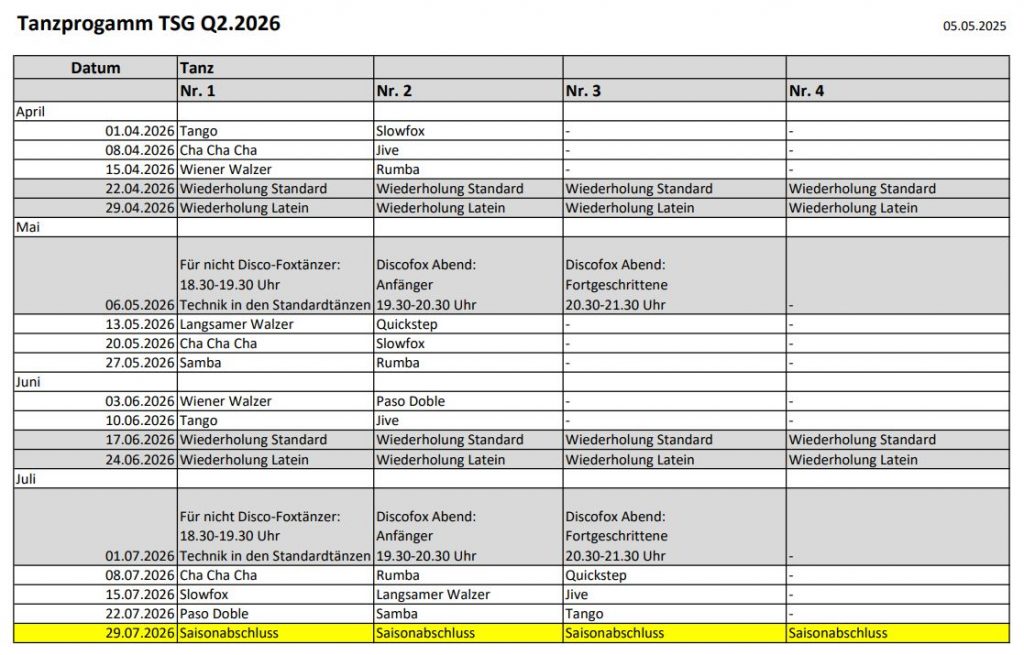 Nach dem der erste Wiedereinsteigerkurs mit den Tänzen Cha Cha Cha, Langsamer Walzer, Jive und Disco-Fox ein voller Erfolg war planen wir weitere, neue Kurse anzubieten.